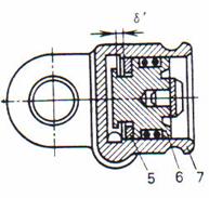 Fig.2.12.Dispozitive de reglare automata continua a jocului dintre saboti si tambur: a)cu frictiune pe sabot: 1-bolt fixat pe taler; 2-bucsa cu guler; 3-saibe de frictiune; 4-inima sabotului; 5-piulita; 6-arc elicoidal; δ'-jocul prescris; b)cu frictiune in cilindrul receptor: 5-segment elastic; 6-piston; 7-cilindru receptor; δ'-jocul prescris.