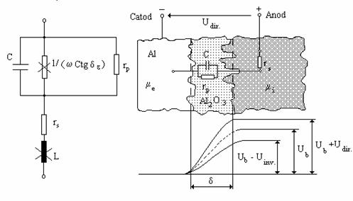 Catodul este alcatuit dintr-o folie din aluminiu, cu conductivitate electronica, electronii avānd mobilitate "me" ridicata, iar anodul este un electrolit cu actiune oxidanta asupra aluminiului si cu conductivitate ionica, ionii avānd mobilitate "mi" redusa, ceea ce justifica introducerea īn schema echivalenta a rezistentei serie "rs". Capacitatea condensatorului depinde de grosimea "d" a stratului dielectric din oxid de aluminiu, precum si de suprafata efectiva a armaturilor, care depinde de gradul de rugozitate al stratului de oxid si al foliei din aluminiu. Īn absenta unei tensiuni aplicate īntre electrozi, īntre folia din aluminiu si electrolit exista o bariera de potential electrochimic "Ub", care nu permite purtatorilor de sarcina: electroni sau ioni, sa strabata jonctiunea.