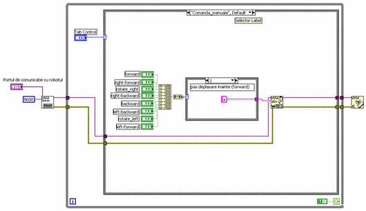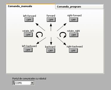 In figura 9 se observa ca, in cazul acestei sectiuni, operatorul are controlul asuprea fiecarui tip de comanda prin apasarea butonului corespunzator. Trebuie mentionat ca pentru o functionare corecta a minirobotului portul de comunicatie trebuie ales la inceputul pornirii aplicatiei. In cazul indicarii unui port serial gresit datele se pierd astfel ca minirobotul nu va executa nici o miscare.