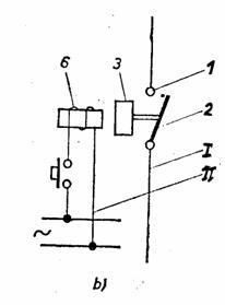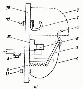 1-contact fix; 2 contact mobil;3-armatura electromagnetului; 4-legatura flexibila; 5-electromagnet; 6-infasurare;7-camera de stingere; 8-buton de comanda; 9-resort de deschidere; 10-placa de baza; 11-borna de racord; I-circuir principal; II-circuit de