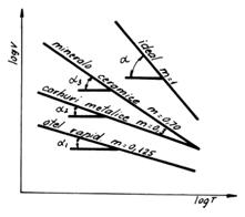 În cazul reprezentarii grafice facuta în coordonate dublu-logaritmice (conform fig.7.2.), se pot stabili valorile exponentului "m" din relatia TIME-TAYLOR simplificata (7.3.). Astfel, dupa cum se vede, exponentul "m" este de fapt valoarea tangentei unghiului format de directia dreptei cu directoarea abscisei: