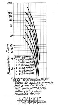 Urmarind o diagrama experimental dedusa (din literatura straina de specialitate), ridicate în coordonate dublu logaritmice (se observa scara valorilor), se remarca faptul ca dependenta dintre durabilitatea T(min) si viteza v(m/min) la diferite valori ale avansului s(mm/rot) nu mai este liniara (fig.7.3.)