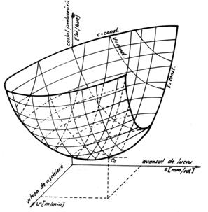 Analizând aceasta forma, se poate constata ca pentru micsorarea costului de prelucrare C, modul cel mai avantajos este de a mari pe cât posibil în primul rând adâncimea (t), apoi avansul (s) si în ultima instanta viteza(v).