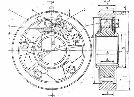 Fig 11. Cuplaj centrifugal cu saboti: 1- sabot; 2- tambur; 3- disc; 4- bolt; 5- arec; 6- garnitura.