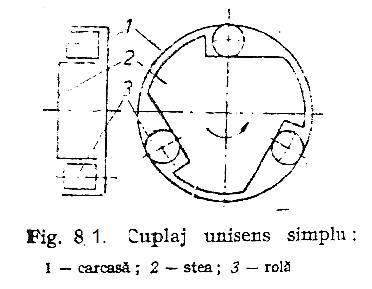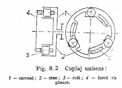 Cuplajul din fig 8.2 il schematizeaza pe cel din fig 7. Element conducator poate fi oricare din cele trei: carcasa 1, furca 4, steaua 2 cu conditia ca sensul lor de rotatie sa asigure impanarea rolei in partea ingusta a spatiului in forma de pana dintre 1si 2. De exemplu, daca 1 este element conducator iar 2 si 4 elemente conduse, atunci la rotirea carcasei 1in sens orar rolele se impaneaza si sunt antreanate in sens orar atat steaua 2 cat si furca 4. Daca momentul rezistent la furca este suficient de mare, se poate ajunge la deblocarea rolelor si la intreruperea, nedorita, a miscarii. Acest cuplj poate lega trei lanturi cinematice.