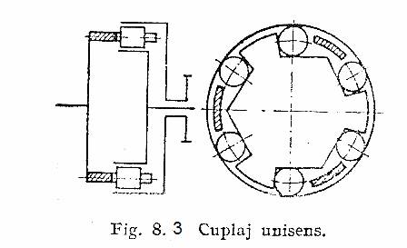 Cuplaje unisens. Constructia si functionarea cuplajelor unisens reies din figura 7. Semicuplajul stea 6, impanat pe arbore, are forma astfel incat formeaza cu semicuplajul 4 niste spatii in forma de pana.