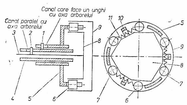 pistonasele 3, montate pe arcurile 2 in locasurile semicuplajului 6. La rotirea