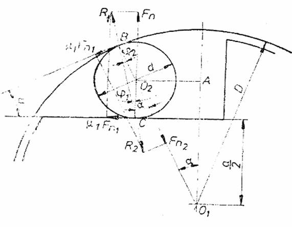 Fortele care actioneaza asupra unei role sunt indicate in fig 11 Pentru ca rola sa ramana impanata si in echilibru, rezultatele R1 si R2 trebuie sa aiba acelasi suport si acelasi modul (sens contrar). Daca se considera coeficientii de frecare (respectiv unghiurile de frecare) dintre rola si cele doua semicuplaje ca fiind egali (Q1=Q2=Q), se observa ca