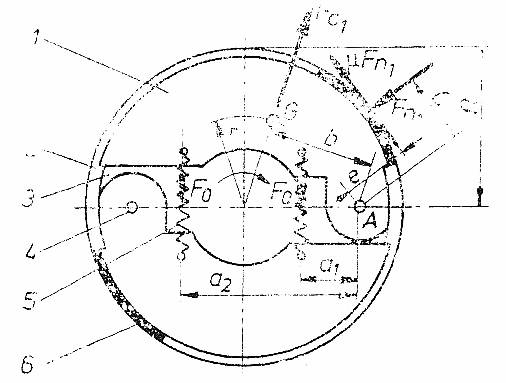 Se evita astfel cuplarea in sarcina inainte ca arborele motor sa fi inmagazinat o energie cinetica suficienta.A mbreiajul centrifugal consta, in principiu, dintr-un disc 3 montat pe arborele motor si un tambur 2 montat pe arborele condus. Pe discul 3 sunt articulati sabotii 1, legati intre ei prin arcurile 5. Sabotii sunt captusiti cu materiale de frictiune 6. In figura 11 s-au luat in considerae fortele care actioneaza asupra unui sabot in timpul functionarii. Considerand echilibrul unui sabot, in timpul functionarii la turatia nominala, se scriu momentele fata de articulatia A: