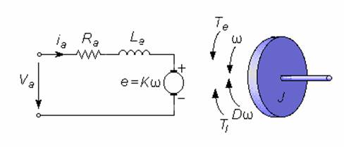 A common actuator in control systems is the DC motor. It directly provides rotary motion and, coupled with wheels or drums and cables, can provide transitional motion. The electric circuit of the armature and the free body diagram of the rotor are shown in the following figure: