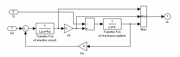 Block diagram shown in Fig. 2 is implemented in SIMULINK file undermaskdcmotormodel1.mdl . An example for simulation is contained in SIMULINK file dcmotormodel1.mdl (see Fig. 3).