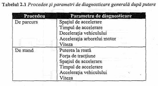 Diagnosticarea generala dupa puterea la roata se poate face prin doua procedee principial diferite: in parcurs si pe stand, parametrii de diagnoslicare disponibili fiind prezentati in tabelul 2.1. Dupa cum arata formula 2.1., in ambele cazuri rezultatele sunt influentate de regimul de viteza al masinii, exprimat prin turatia motorului in probele de stand si viteza de rulaj la probele de parcurs.