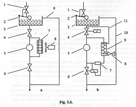 in figura 2.6,b se prezinta o schema hidraulica cu reglare automata a regimului termic; in acest scop se foloseste sonda termostatica 7 care comanda robinetul 6 actionat electromagnetic.
