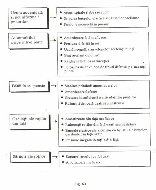 Cele mai frecvente defecte ale suspensiei sunt ruperea, slabirea arcurilor si a barelor stabilizatoare, uzura bolturilor si a bucselor de prindere, uzura sau ruperea limitatoarelor de cauciuc, uzura amortizoarelor, pierderea de lichid din amortizoare, deformarea bratelor suspensiei. Producerea unora din aceste defecte are ca urmare aparitia unor manifestari specifice cum ar fi: zgomote si batai in suspensie, proasta amortizare a oscilatiilor caroseriei (oscilatii prelungite dupa depasirea unei denivelari) si scurgeri de lichid. Simptomele defectarii suspensiei si cauzele lor posibile sunt prezentate in figura 6.1, din care se poate trage concluzia ca, spre deosebire de celelalte ansambluri ale automobilului, suspensia nu admite un sistem de diagnosticare impartit riguros in procedee de diagno 838h75i sticare generala si pe elemente. Parametrii de diagnosticare care ar caracteriza starea generala a suspensiei, cum sunt zgomotele, socurile, oscilatiile rotilor s.a.m.d., au legaturi multiple si cu alte parti ale autovehiculului nefiind caracteristice doar suspensiei.