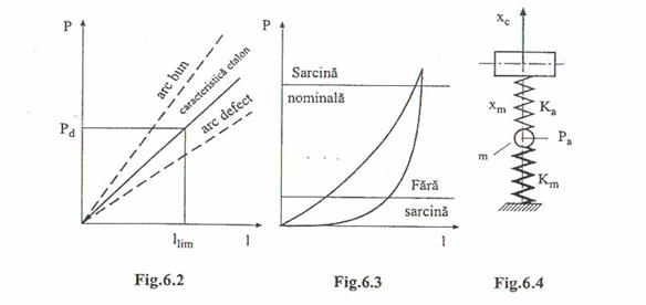 Pe langa controlul vizual care urmareste descoperirea defectelor exterioare, arcul este supus unui test care are ca scop stabilirea elasticitatii prin determinarea caracteristicii sale, adica a variatiei lungimii sale efective l (la arcurile elicoidale) in functie de sarcina P (figura 6.2), lungimea efectiva fiind luata ca parametru de diagnosticare. Daca linia caracteristica a arcului se afla sub caracteristica etalon, arcul trebuie schimbat. Deoarece determinarea pe vehicul a caracteristicii efective a arcului este complicata, se obisnuieste sa se aplice pe roata respectiva o sarcina de diagnosticare Pd masurandu-se lungimea arcului in aceasta situatie; daca aceasta este sub limita admisibila llim se considera ca arcul este slabit si trebuie schimbat. In conformitate cu STAS 6926/13-70, verificarea calitatii suspensiei se face prin determinarea caracteristicii acesteia si compararea deformatiei arcului cu datele limita in doua situatii: cu incarcatura nominala si fara incarcatura, atat la comprimare, cat si la revenire (fig. 6.3).