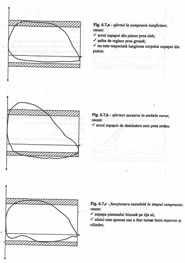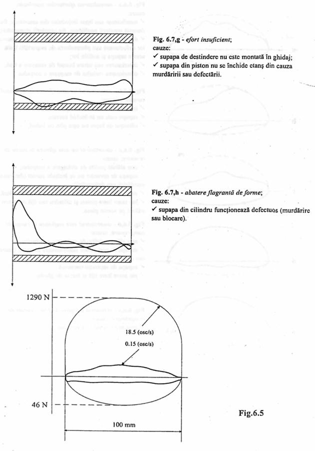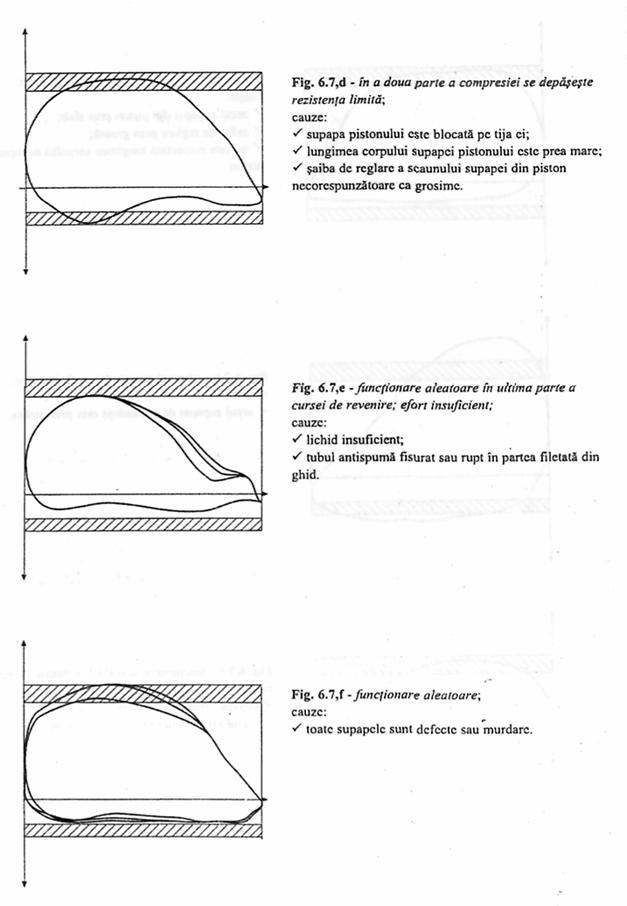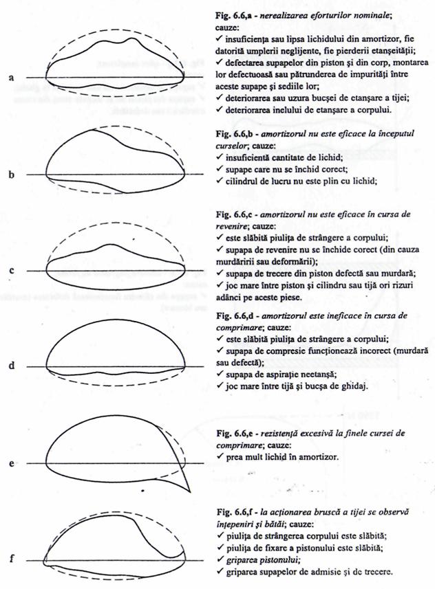 Un prim criteriu de apreciere a starii tehnice a amortizorului il constituie valorile maxime efective ale efortului de comprimare Pe si de revenire Pr Daca acestea ies din domeniu! valorilor limita, amortizorul este defect. Defectiunile sale pot fi detectate dupa forma caracteristicii efective care, la un amortizor defect, prezinta abateri de la caracteristica etalon, specifice fiecarei defectiuni. In succesiunea de caracteristici din figura 6.6 sunt prezentate cateva diagrame specifice unor defecte intalnite frecvent la amortizoarele clasice (cu duble supape in piston si corp), insotite de cauzele posibile ale producerii lor. Aceleasi informatii sunt oferite in fig. 6.7 pentru amortizoarele de tip Armstrong.