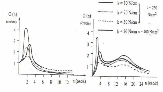 Graficele arata, pe de alta parte, ca modificarea rigiditatii arcului provoaca schimbarea simultana atat a amplitudinii maxime, cat si a frecventei de rezonanta. Asadar, daca se cunoaste frecventa de rezonanta a suspensiei vehiculului testat, atunci abaterea valorii frecventei de rezonanta determinate experimental in raport cu valoarea sa nominala constituie indiciul modificarii elasticitatii arcului. Aceasta observatie atrage atentia inca o data asupra necesitatii verificarii prealabile a starii arcului, ca o premisa strict necesara pentru a obtine rezultate exacte privind calitatea amortizorului diagnosticat pe aceasta cale.
