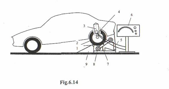 O constructie aparte o reprezinta solutia construita dupa un patent S.U.A. (nr. 3.477.273), prezentata in figura 6.14, care cuprinde un plan inclinat 9, prevazut cu o rola 1 si un suport cu rola 7, intre care se afla excentricul 8 actionat prin lant Gali de electromotorul 5. Automobilul se aduce cu roata 2 pe excentric, iar pe amortizorul 3 se monteaza traductorul termic 4; aici ca parametru de diagnosticare se foloseste temperatura amortizorului in timpul oscilatiilor, marime inregistrata pe panoul de afisaj 6.