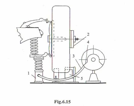 in figura 6.12 este prezentat un stand de fabricatie Boge pentru incercarea amortizoarelor, la care miscarea de rotatie a arborelui motorului electric 8 este transformata in miscare oscilatorie de dispozitivul cu excentric 9, uniformitatea miscarii fiind asigurata de volantul 7. Prin arcul 5 si dispozitivul de reglare 4, miscarea este transmisa bratului 1, acesta din urma actionand platforma 10 pe care se afla una din rotile automobilului. Oscilatiile caroseriei sunt inregistrate de dispozitivul 3 pe o diagrama circulara, dispozitivul fiind actionat de motorasul electric 2.