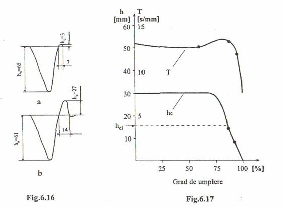 in figura 6.16,a este prezentata caracteristica etalon a oscilatiei libere a caroseriei (deci pentru un amortizor cu stare tehnica buna) iar in figura 6.16,b aceeasi caracteristica obtinuta cu un amortizor care contine numai 75% din cantitatea necesara de lichid. Se observa ca la amortizorul defect amplitudinea oscilatiei libere, ca si perioada acesteia, s-au modificat. Din graficul 6.17 se vede ca gradul de umplere cu lichid influenteaza mai ales amplitudinea oscilatiei din a doua parte a procesului, hc, la fel ca si perioada oscilatiei T. Se observa ca reducerea umplerii sub 75% inrautateste rapid si substantial calitatea amortizorului, iar sub 60% amortizorul devine practic total ineficace. Deoarece amplitudinea hc constituie elementul cel mai sensibil, ea este aleasa ca parametru de diagnosticare care se compara cu valoarea limita hcl specifica fiecarui vehicul; in cazul prezentat in figurile precedente hcl =15 corespunde unui grad de umplere al amortizorului de circa 83%. Depasirea valorii limita hcl poate fi provocata nu numai de lipsa lichidului din amortizor ci si de alte defectiuni, cum sunt blocarea sau ruperea supapei de trecere si ruperea arcului supapei de revenire.