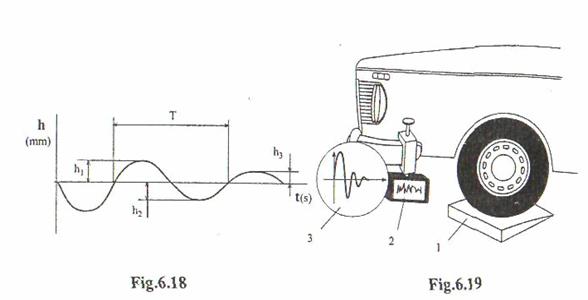 Al doilea procedeu de lansare a caroseriei este mai simplu si usor de aplicat, putandu-se obtine elongapi mai mari decat cele produse prin metoda apasarii - de aceea acest procedeu este mai larg folosit. intr-o prima varianta, roata al carei amortizor trebuie verificat este ridicata cu un cric special a carui constructie permite eliberarea ei brusca. intr-o alta varianta ansamblul este pus sa depaseasca un obstacol de tip pana 1, ca in fig.6.19. In ambele cazuri vibrograful se monteaza pe aripa sau pe bara de protectie in apropierea amortizorului testat.