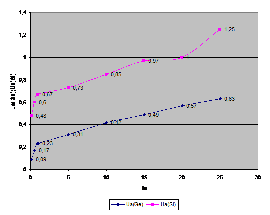 Se calculeaza rezistentele de c.c (R=UA/IA) si de semnal mic (ri=dUA/IA) ale diodelor in punctele Ia=1mA, 10mA si 20mA. Pentru aceleasi puncte se determina tensiunea de prag UD, prelungind tangenta la caracteristica in punctul considerat pana cand intersecteaza axa absciselor.