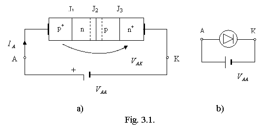 S-a stabilit un transfer de electroni si goluri prin J2 => J2 a basculat în conductie, astfel apare un curent de goluri care se închide de la zona P+ la catodul K si un curent de electroni de la N+ la anodul A.