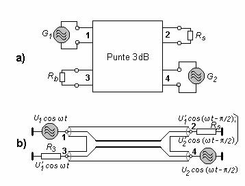 Un dispozitiv în punte de însumare a puterilor poate fi considerata ca o retea cu 4 porturi (fig. 87a); la doua porturi sunt conectate rezistentele Rs si Rb, iar la celelalte doua - generatoarele, care nu sunt cuplate (nu exista influenta) între ele în cazul realizarii echilibrarii.