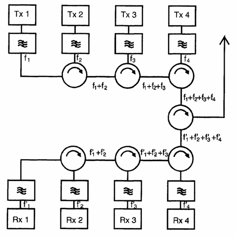 În figura este prezentata o statie de RR cu patru emitatoare, respectiv patru receptoare conectate la antena prin intermediul circulatorilor.