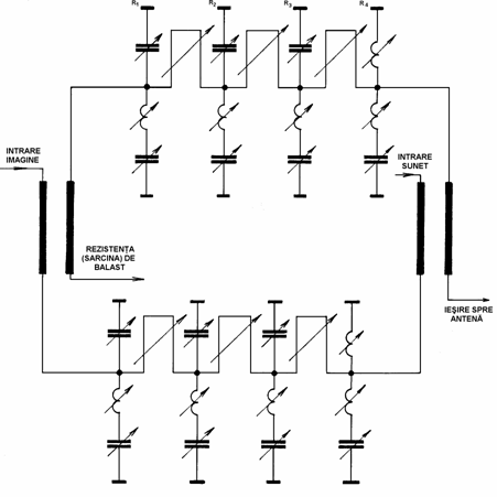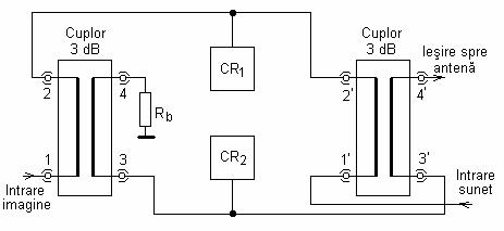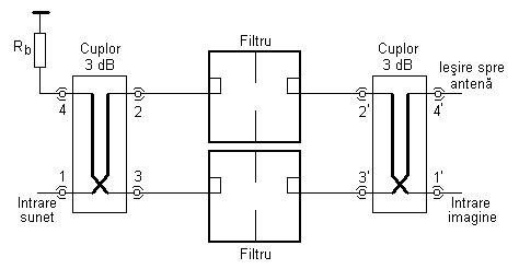 Puterea corespunzatoare frecventei purtatoare imagine se aplica portului 1 al cuplorului din dreapta. Filtrele prezinta pentru aceasta frecventa o impedanta mare, asa încât, ea va fi reflectata si însumata la portul 4 spre antena.