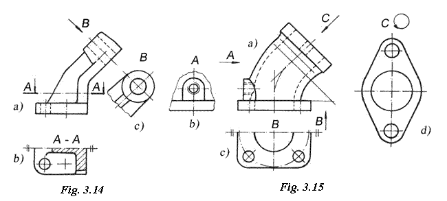 b) vedere particulara, daca este obtinuta dupa alte directii de proiectie diferite de cele definite prin STAS 614-76 sau daca este obtinuta dupa una din directiile definite conform STAS 614-76, dar este dispusa pe desen în alta pozitie (de exemplu, fig. 3.14c; 3.15b; 3.15d).
