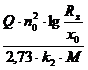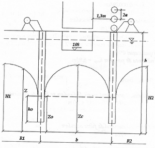 In relatia (2) se impune pentru z0 o valoare mai mica decat ultima valoare a lui z0 determinat cu formula (1). Se determina Q. Se obtine graficul Q=f(z0) ce va fi o linie dreapta ce trece prin punctele z0 =108 m si Q0 = 0 m3/s si cel de-al doilea punct este determinat mai sus cu relatia (2). In centrul incintei cota nivelului freatic dupa coborare se determina cu relatia: