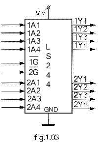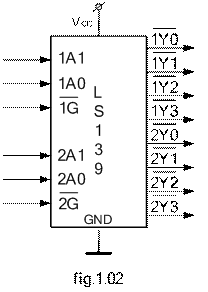 Conform celor prezentate pentru precedentul circuit capsula contine doua decodificatoare identice de la 2 la 4. Schema sa functionala se prezinta īn figura 1.02.