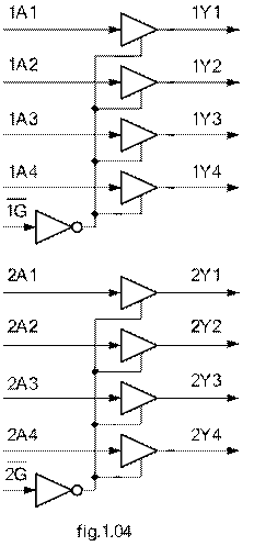 Observam ca avem de-a face cu doua amplificatoare separatoare cu cāte 4 cai, fiecare amplificator avānd si o intrare de validare activa la nivel logic 0. Terminalele specifice unui asemenea circuit sunt :