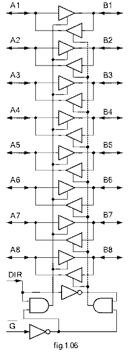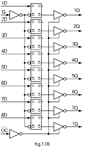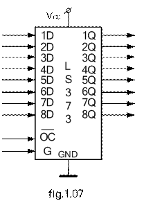 Cu 8 ranguri, fiecare bistabil din componenta fiind de tipul cu 3 stari. Īn aplicatiile cu microprocesoare el se utilizeaaza pentru de multiplexarea magistralelor magistralelor microprocesoarelor.. A cunoscut o larga raspāndire īn aplicatiile ce utilizeaza microprocesorul 8086. Configuratia functionala a terminalelor cipului se prezinta īn figura 1,xx. Pentru realizarea functiilor pentru care a fos concepu, registrul are o schema interna ca cea din figura 1.xx. Din analiza acestei a observam existenta a 8 bistabile de tip D corespunzatoare rangurilor registrului. Registrul este prevazut cu urmatoarele intrari/iesiri: