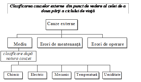 In general, cauzele externe ale defectelor includ cauze datorate mediului, erori de mentenanta sau erori de operare ale sistemului, aparand in cea de a doua parte a ciclului de viata al unei entitati. O clasificare apare in figura.