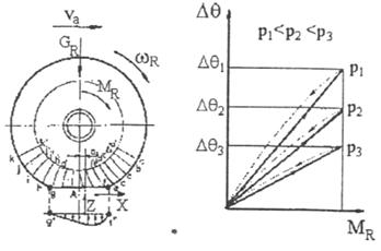 Deformatia tangentiala nu depinde numai de rigiditatea materialului anvelopei ci si de presiunea interioara a pneului. in figura 11,b, este prezentata variatia deformatiei tangentiale, exprimata unghiular (Dq), functie de momentul aplicat la roata Mr pentru sarcina radiala Gr constanta si diferite presiuni interioare in pneu (p1<p2<p3). Si in acest caz se remarca aparitia fenomenului de histerezis si o crestere a deformatiei odata cu scaderea presiunii din pneu.