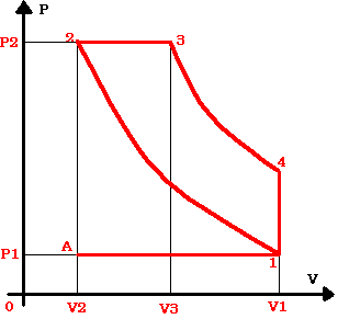 Trasand schema de functionare a motorului diesel, in sistemul de coordonate presiune (p) si volum (v), observam urmatoarele transformari, in functie de cei 4 timpi ai motorului: