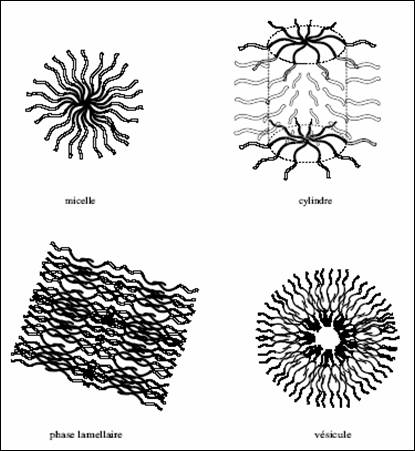 Dans les deux cas, les parties hydrophobes s'associent par "effet hydrophobe" pour diminuer l'aire des parties hydrophobes en contact avec l'eau en forme de: micelle, cylindre avec un coeur hydrophobe ou sous forme lamellaire. In both cases, the hydrophobic parts associate due to an "hydrophobic effect" to diminish the air formed as the hydrophobic parts make contact with water, in the form of: micelle, cylinder with a hydrophobic core or in lamellar shape.