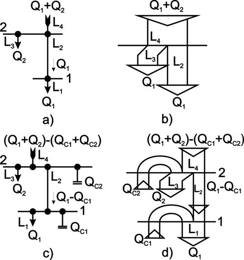 Din figura 1 rezulta ca daca în schema nu se instaleaza baterii de condensatoare, liniile din aval (L1) si din amonte (L2) de nodul 1 vehiculeaza aceeasi putere reactiva Q1; linia din amonte de nodul 2 vehiculeaza puterea reactiva totala Q1+Q2.
