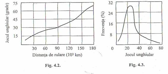 Jocul unghiular total din lantul cinematic a organelor care compun transmisia exprima gradul de uzare si corectitudinea reglajului elementelor acestuia, constituind astfel un indice al starii tehnice generale a transmisiei. El inregistreaza o crestere aproape liniara in timp, pe masura cresterii parcursului realizat de automobil (fig. 4.2.).