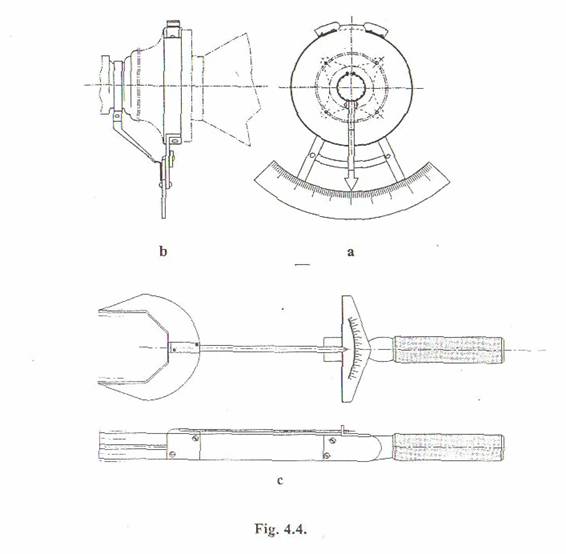 Un astfel de dispozitiv este prezentat in figura 4.4.a, dimensiunile sale depinzand de tipul de automobil pentru care se va utiliza. Deviatiile unghiulare la anularea jocului in transmisie prin rotirea rotii se pot citi pe cadranul-raportor. Dispozitivul se monteaza pe butucul rotii (fig. 4.4.b), iar actionarea se face cu o cheie dinamometrica (fig. 4.4.c) cu un cuplu de 2.2,5 daNm.
