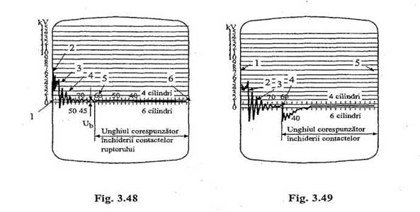 in zona inchiderii contactelor ruptorului se observa o acoperire a semnalelor suprapuse, acoperire care nu trebuie sa fie mai mare de 3° la o instalatie considerata a fi in stare tehnica buna.