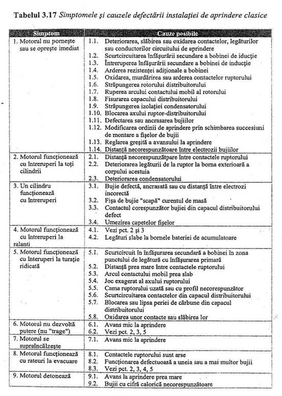 in tabelul 3.17 sunt prezentate simptomele si cauzele principalelor defectiuni ale instalatiei de aprindere clasice.