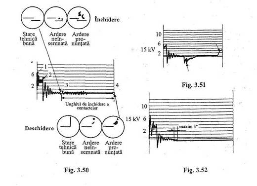 In diagrama tensiunii secundare (fig. 3.51) starea tehnica proasta a contactelor face ca zonele de deschidere si inchidere a lor sa nu mai fie nete, existand semnale parazite. Oscilatiile cu amplitudine initiala mare in zona inchiderii contactelor indica defectarea acestora. De asemenea, si deschiderea contactelor devine nedefinita iar valoarea tensiunii secundare se micsoreaza.