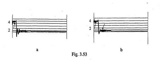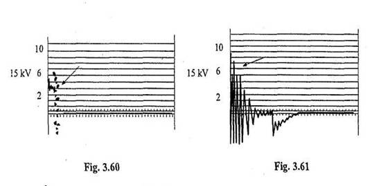 Contactul defectuos al firului condensatorului sau intreruperea lui partiala, produc micsorarea amplitudinii numai a oscilatiilor care apar dupa deschiderea contactelor, in timp ce oscilatiile specifice disparitiei arcului raman practic nemodificate (fig. 3.53, a).