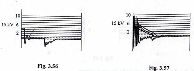 In semnalul tensiunii secundare scurtcircuitarea spirelor infasurarii primare provoaca o puternica deformare a zonei corespunzatoare incetarii arcului electric si lipsa oscilatiilor (fig. 3.56).