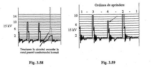 Cand circuitul secundar este in stare buna, inclusiv bujiile, tensiunea secundara maxima nu trebuie sa depaseasca 1 kV, iar abaterea maxima intre cilindri sa fie de max. ±1,5 kV. Cand distanta intre electrozi este mai mica decat cea nominala, tensiunea secundara maxima scade, iar neuniformitatea distantelor intre electrozi duce la depasirea valorii abaterii maxime mentionate (fig. 3.59).