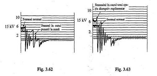 Se vede ca efectele produse de intreruperea fisei de bujie si a defectarii rezistentei antiparazit asupra aspectului diagramei de tensiune secundara sunt asemanatoare. Aceste doua defectiuni pot fi totusi individualizate observand ca in primul caz, imediat dupa deschiderea contactelor ruptorului, se va produce o rapida cadere de tensiune, dar la sfarsitul zonei de intretinere a arcului spatiul disruptiv suplimentar produs de intreruperea fisei de bujie va determina o crestere a tensiunii secundare, facand ca evolutia semnalului sa de deosebeasca de cea normala (fig. 3.63).