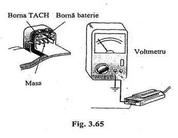 Se cupleaza borna - a voltmetrului la masa si borna + la borna <TACH> a capacului distribuitorului.